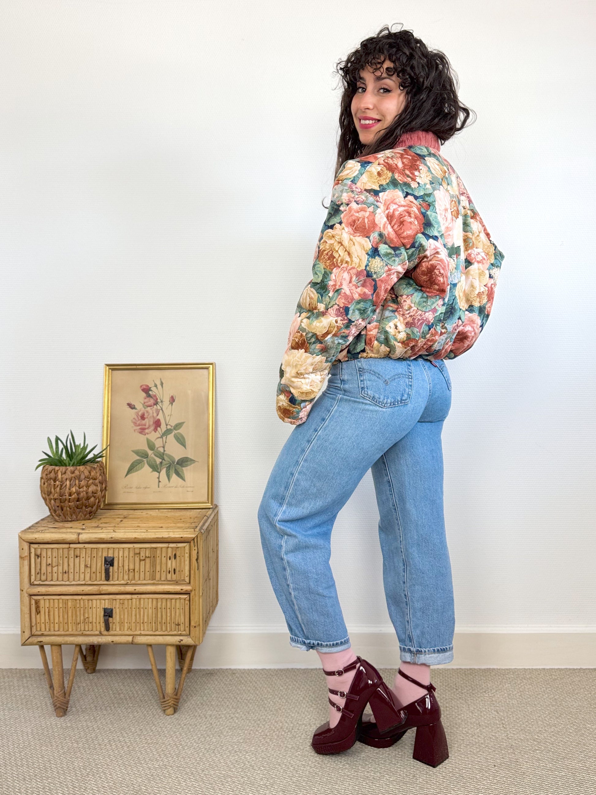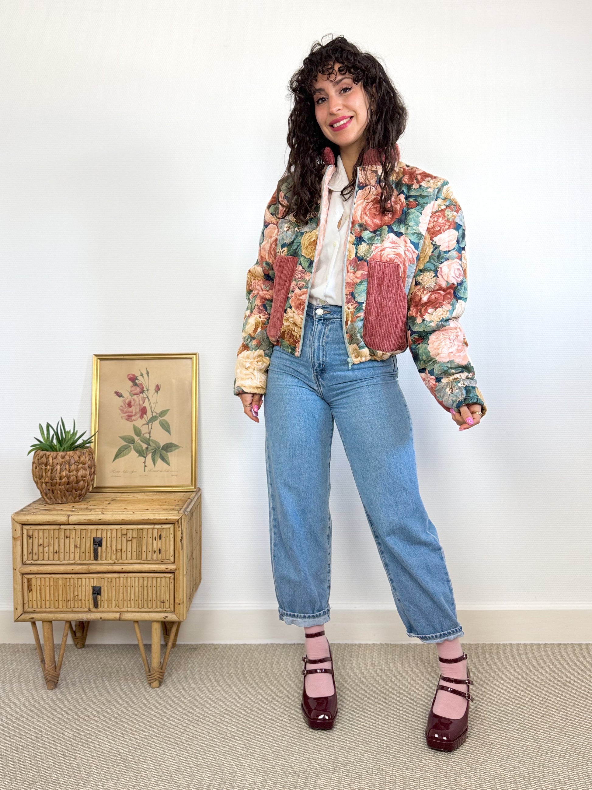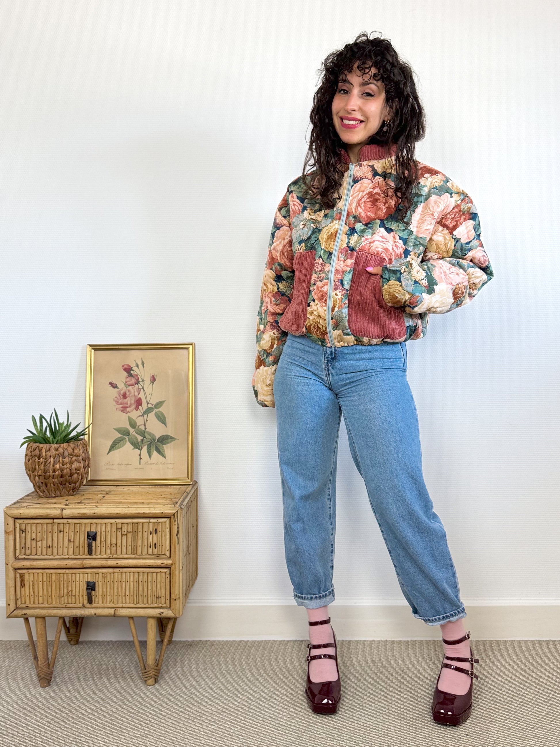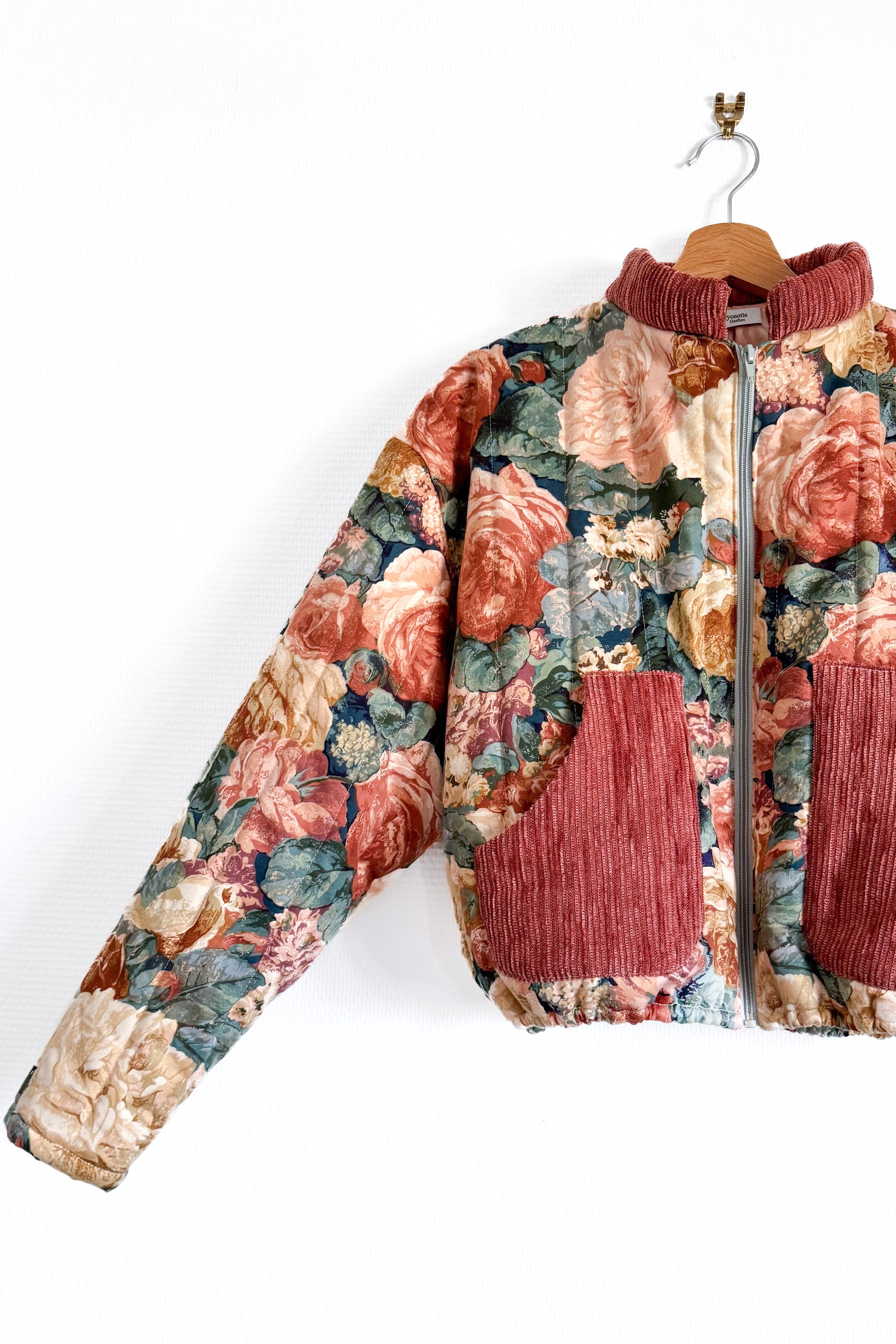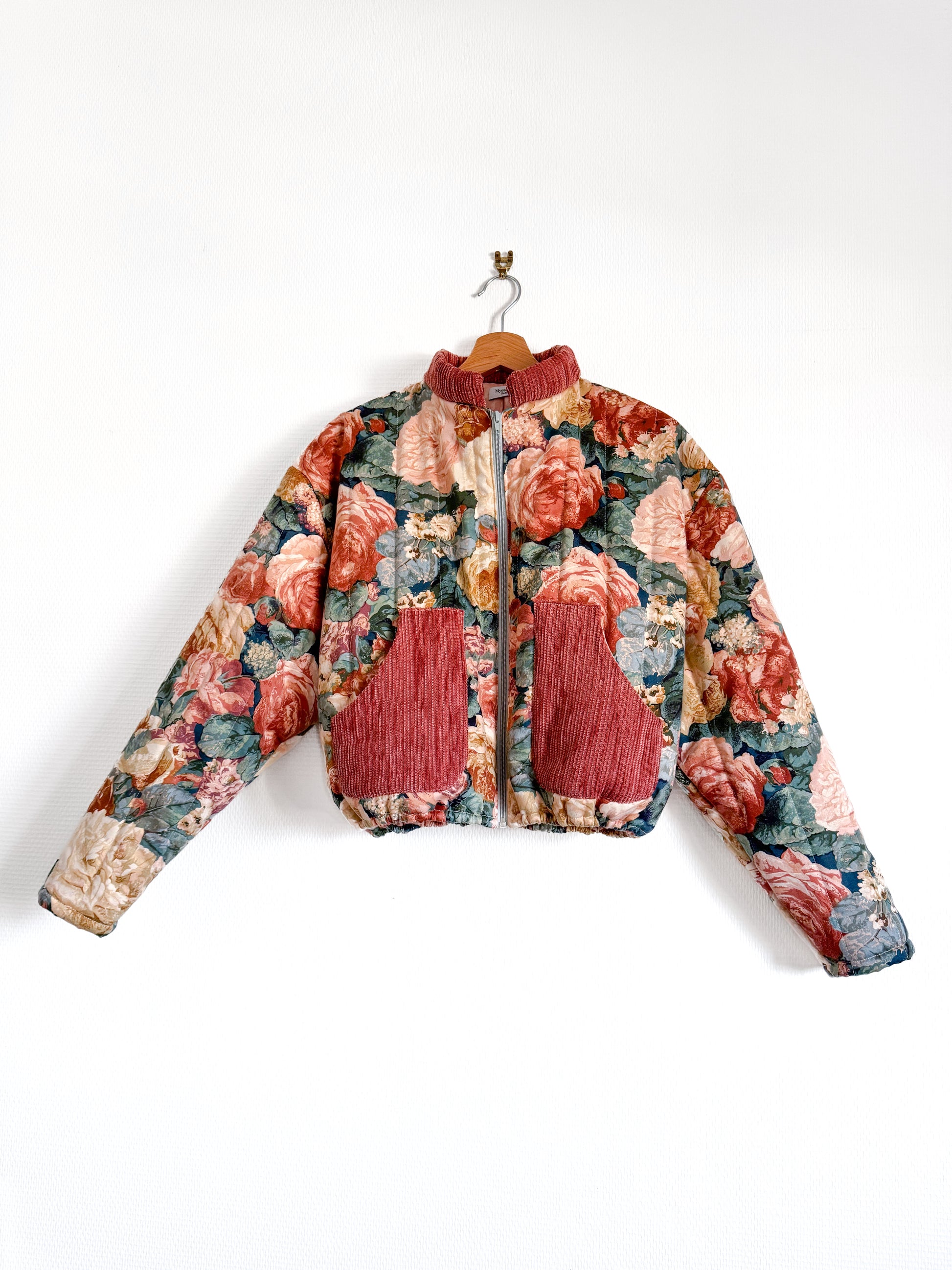Manteau doudoune cousu main dans un coton fleuri que j'ai moi-même matelassé, doublure en satin de polyester, détail col montant et poches plaquées en velours contrastant. Fermeture zip et bas élastiqué pour un rendu blousant.