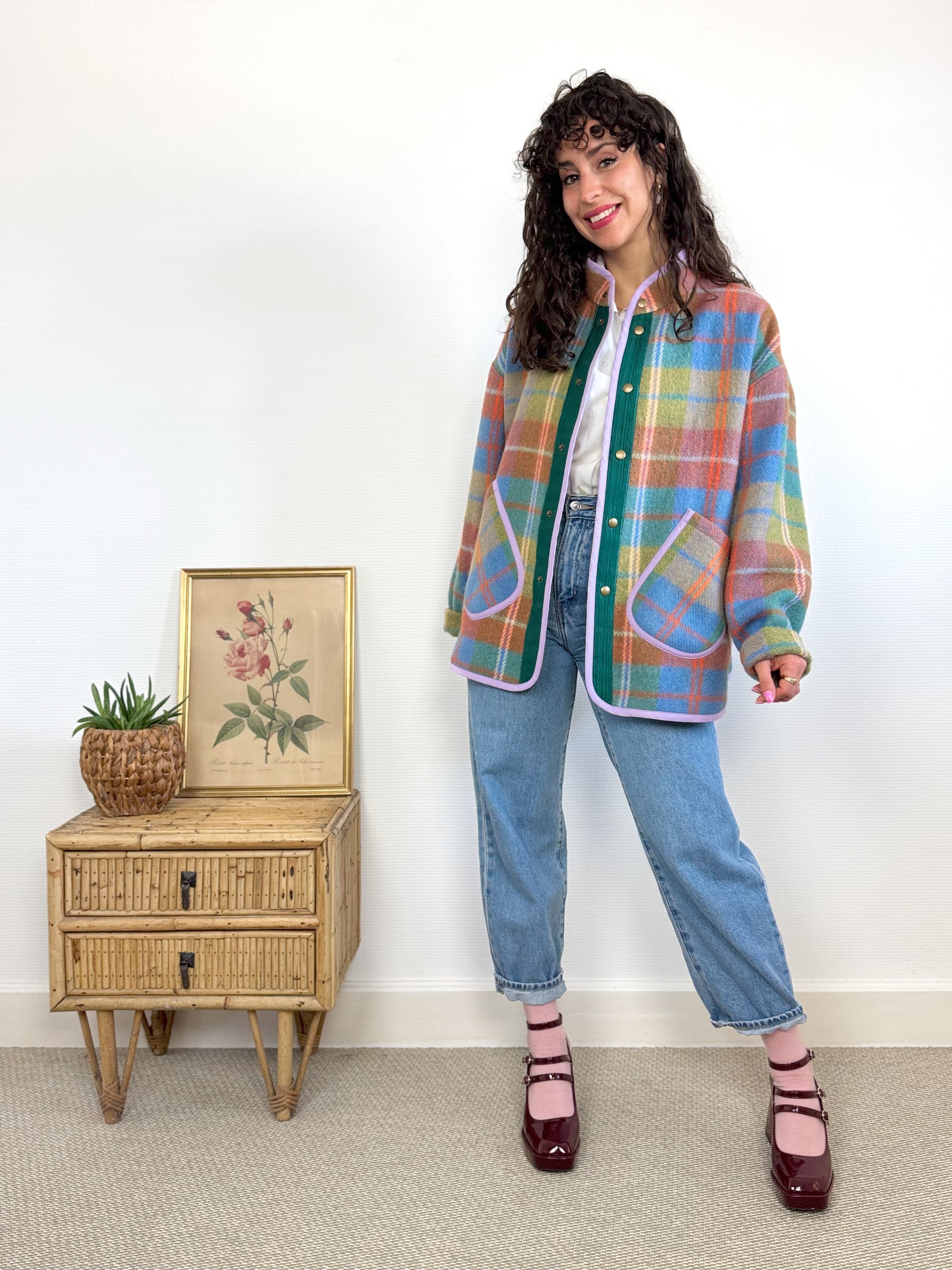 Veste cousue main à partir d'une couverture en laine vintage à motif tartan coloré. Coupe droite et loose à emmanchures basses, poches plaquées, col montant et fermeture boutons pression. Idéale pour la mi-saison !