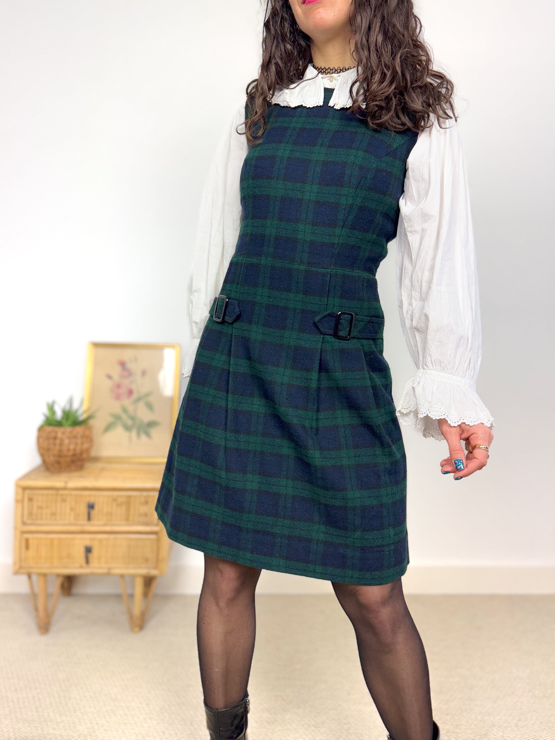 Superbe robe vintage cousue main dans un beau lainage à motif tartan bleu marine et vert, coupe cintrée, ferme avec un zip au milieu du dos. Idéale à porter par dessus un petit chemisier ou pull fin.
