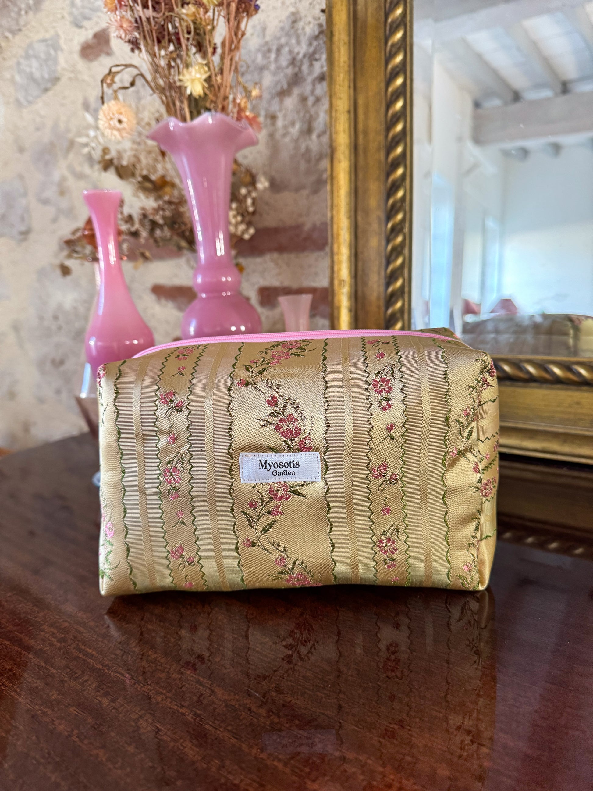 Trousse de toilette cousue par mes soins, en France et dans des tissus upcyclés.